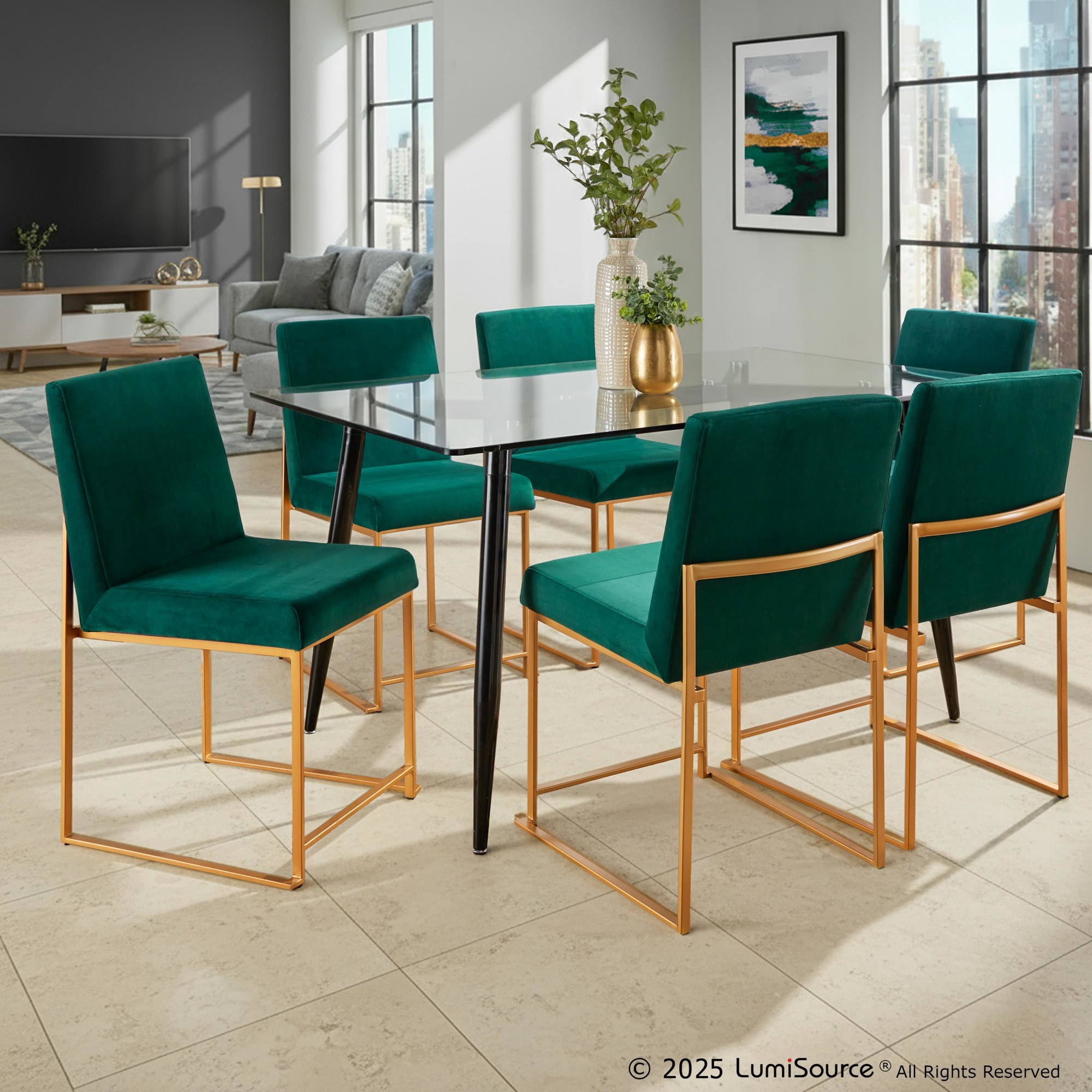 Modern elegance at its finest, the Fuji High Back Dining Chair features an extra-wide (and extra comfortable) upholstered seat, high padded backrest, and stylish metal frame. The perfect dining chair, the Fuji is multi-functional and can be used as extra seating in a sitting room or as a stylish office chair. Available in stainless steel or gold metal frame and a variety of sleek upholstery colors. Pair with the Fuji Dinette Table for a complete look.