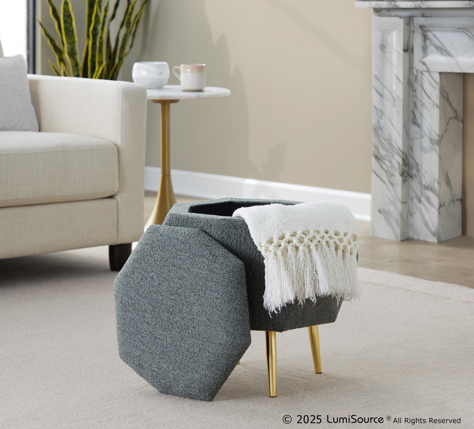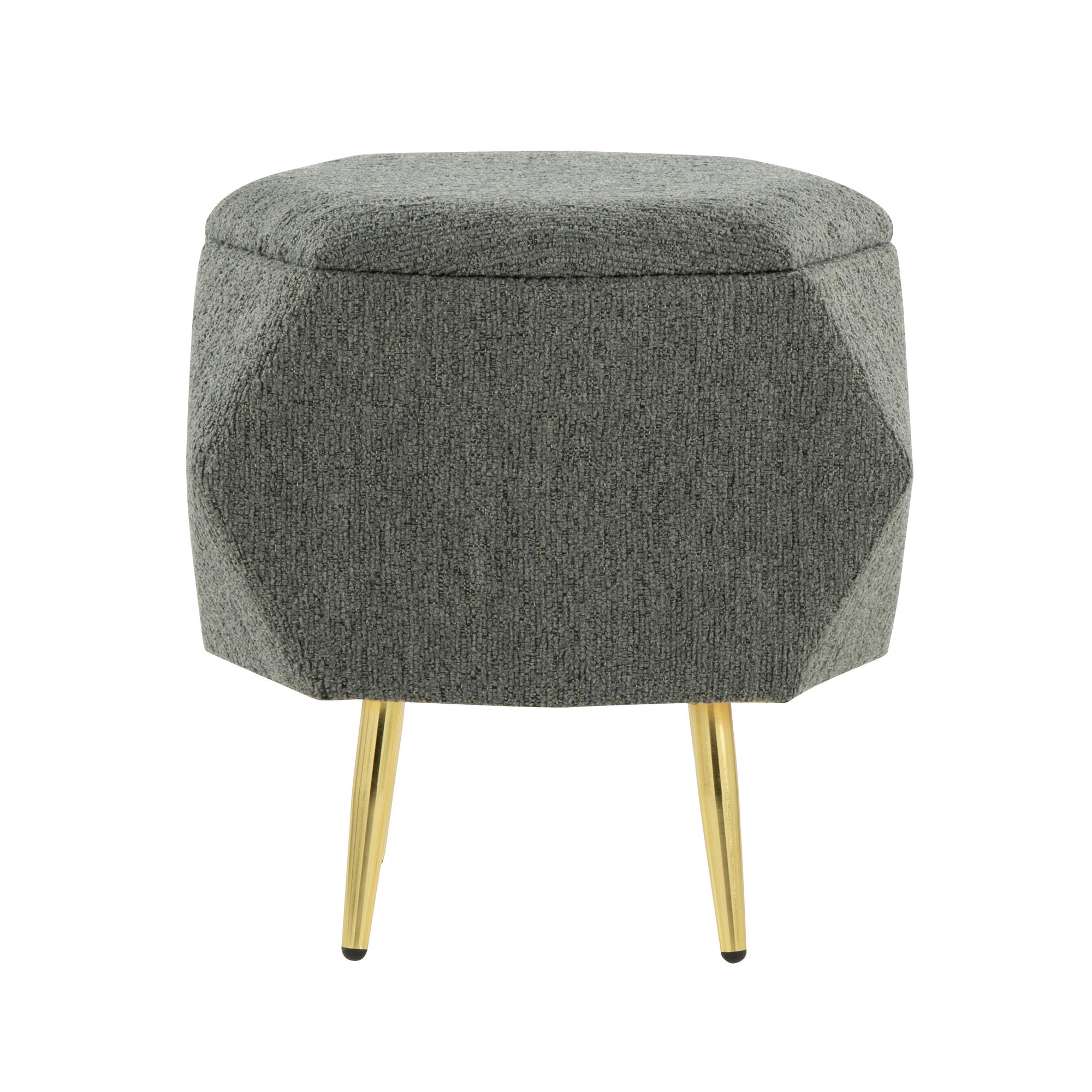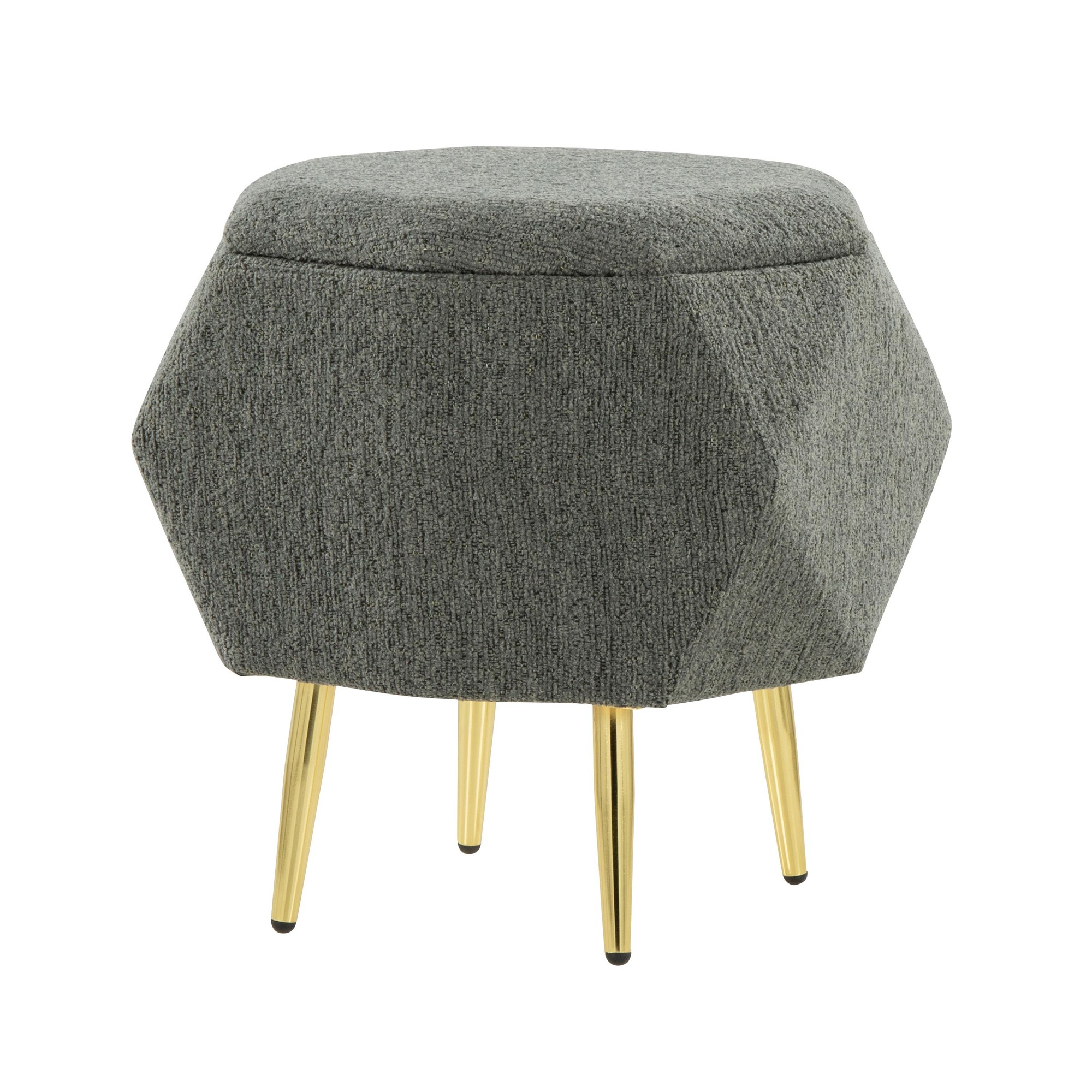 Elevate your décor with the Diamond Ottoman by LumiSource, featuring elegant gold metal legs and a striking diamond-shaped design for a modern, upscale look. Upholstered in soft fabric, it seamlessly combines form and functionality with a removable top providing storage space inside. Both practical and eye-catching, it’s a versatile addition to any living space.