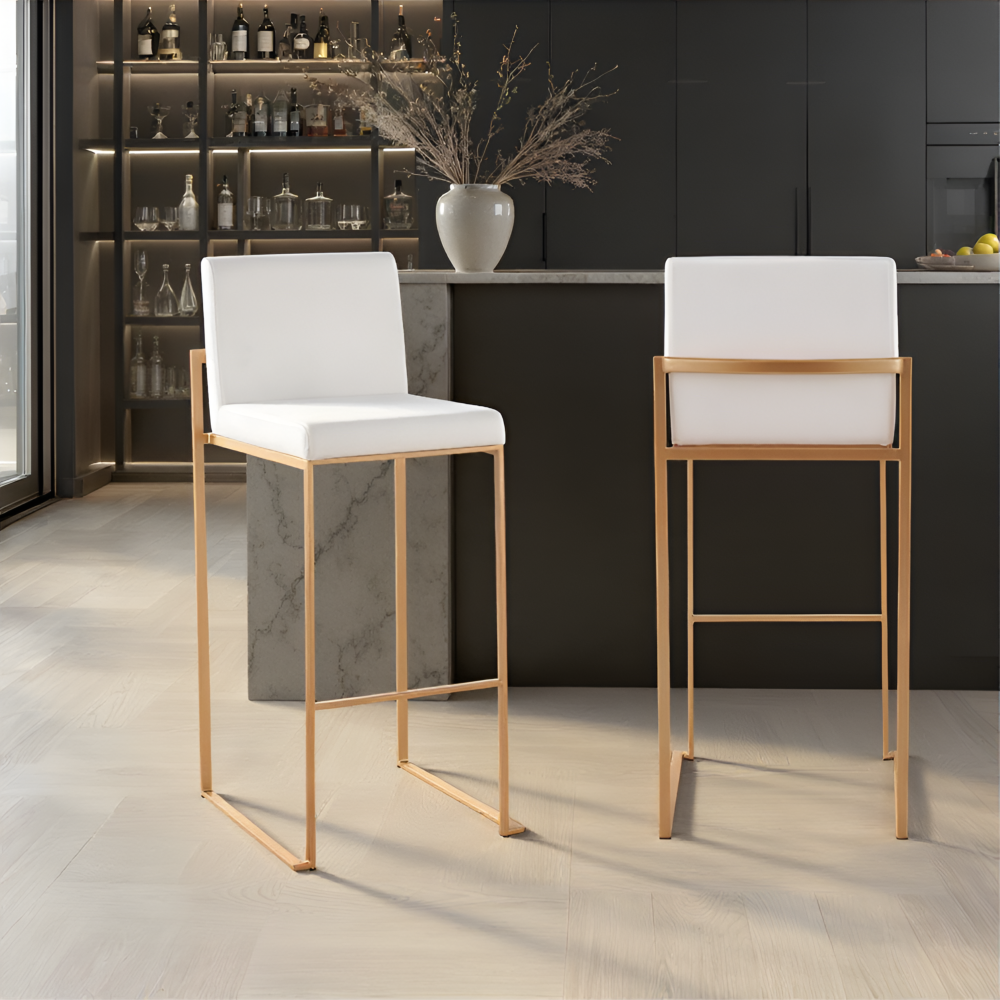 Modern elegance at its finest, the Fuji High Back Bar Stool features an extra-wide (and extra comfortable) upholstered seat, a high padded backrest, and a stylish metal frame. The perfect contemporary bar stool, the Fuji is available in a stainless steel or gold metal frame and comes in a variety of sleek upholstery colors.