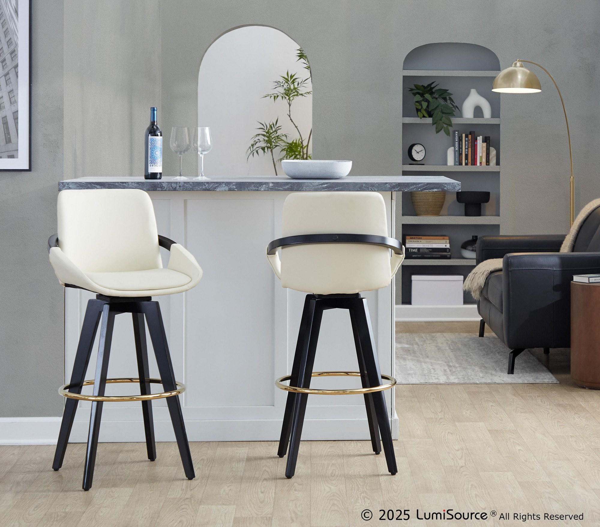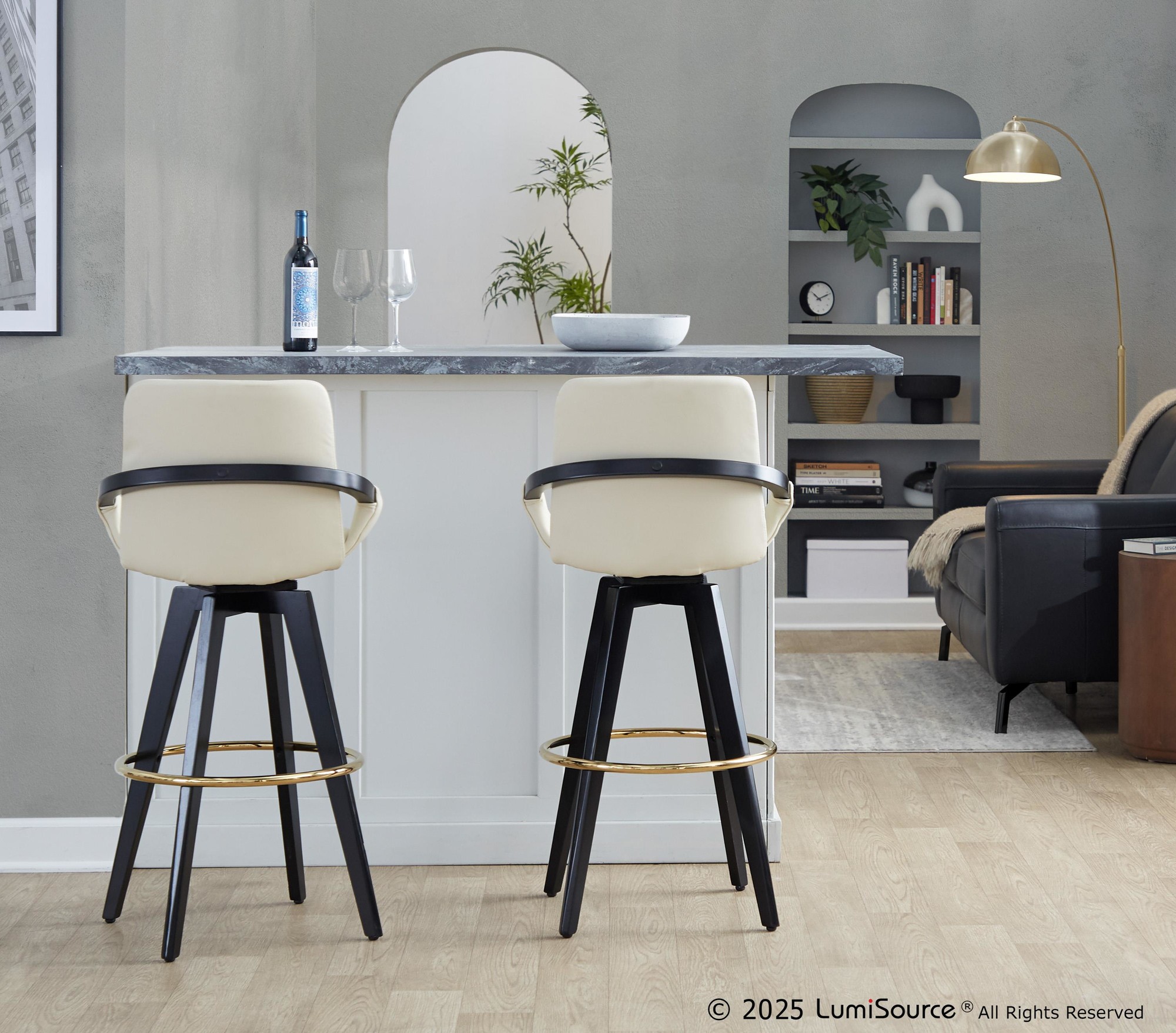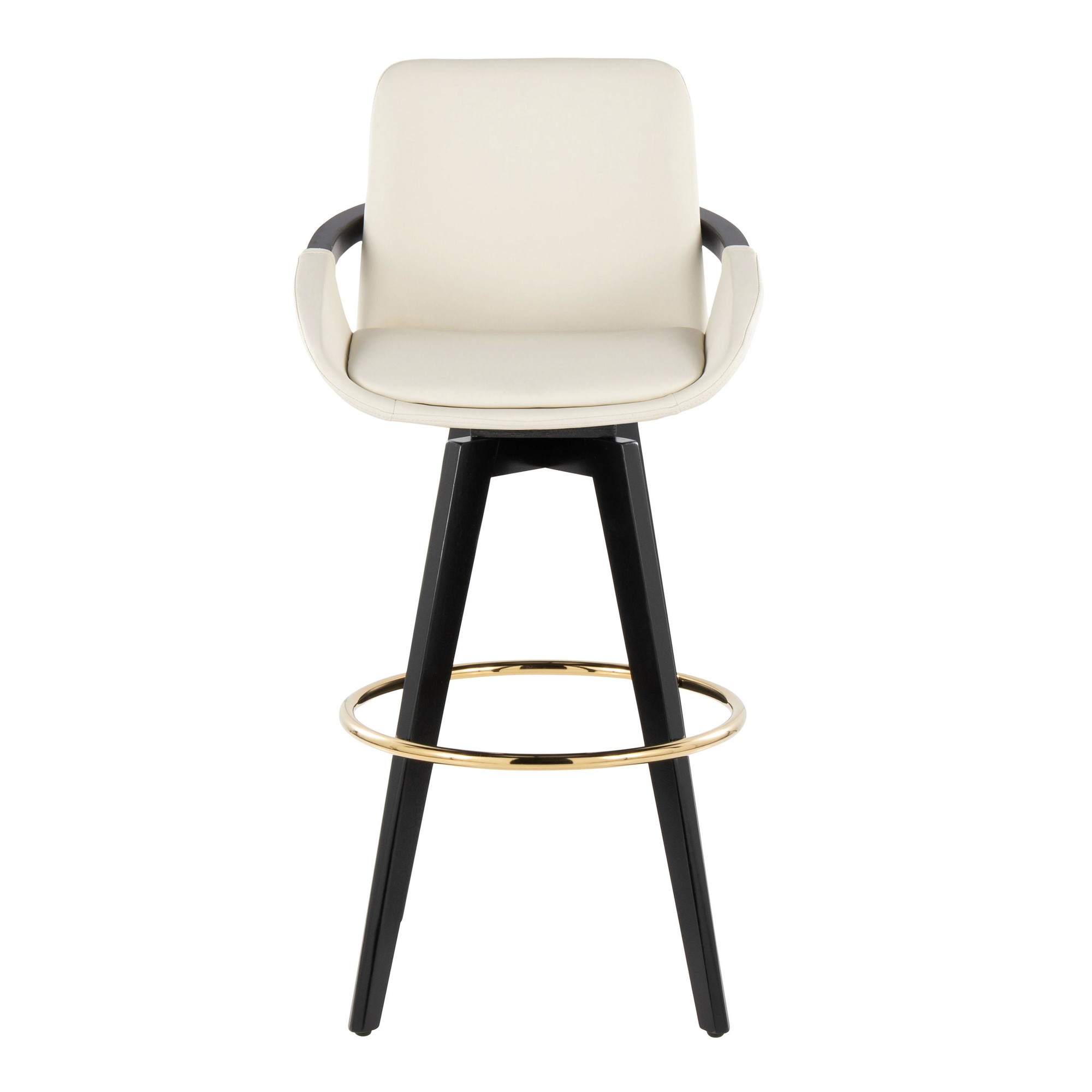 The contemporary design of the Cosmo Fixed-Height Barstool by LumiSource combines style and comfort! An upholstered seat is accented by stylish black wood armrest and legs, with smooth swivel capability. Available in a variety of color combinations, choose the one that fits your space the best.