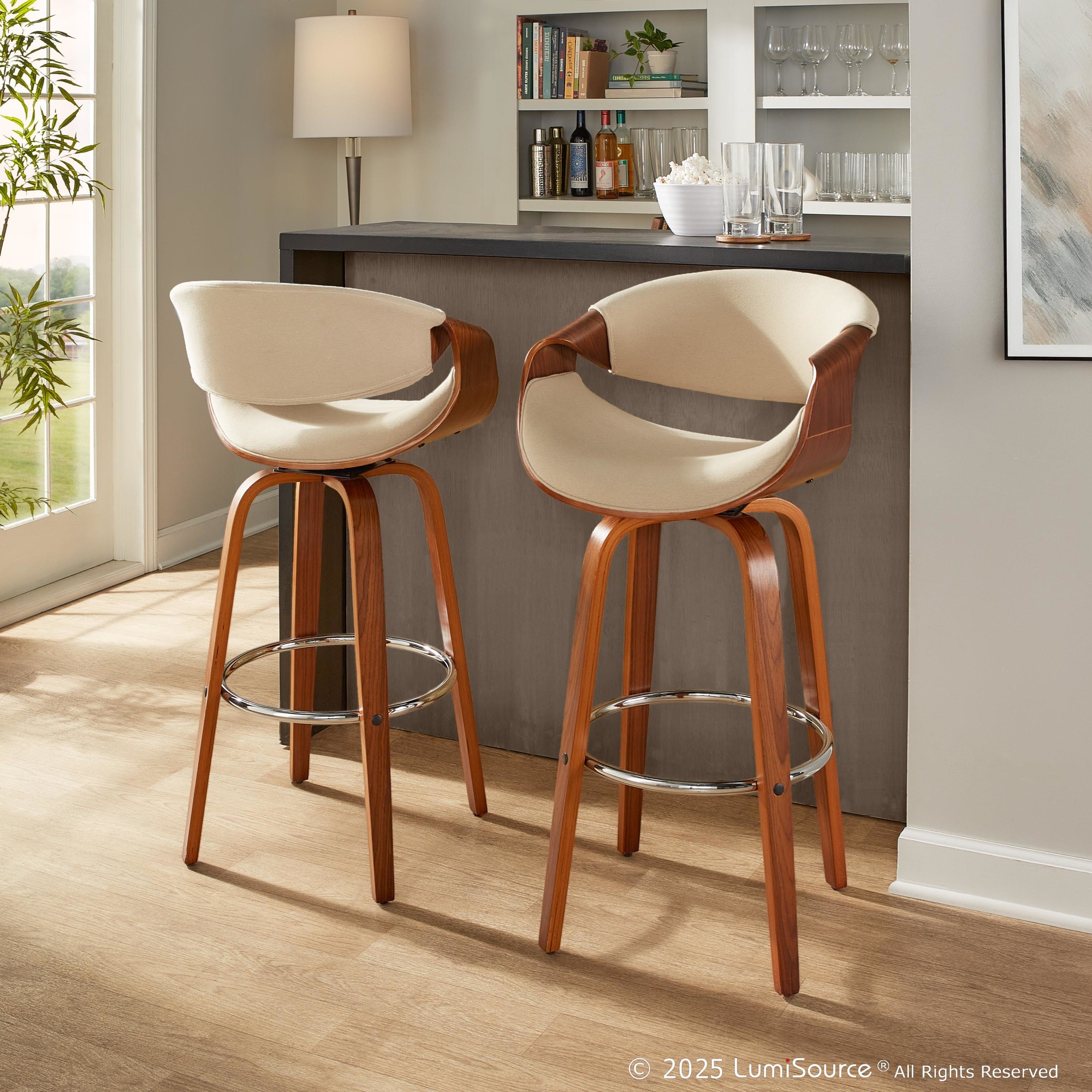 With a curvaceous dose of Mid-Century style, this unique design will look great in a kitchen or bar area. Featuring a walnut finished stationary wood frame, luxurious woven fabric upholstery, swiveling seat, and stylish armrests. The Curvini Bar Stool by LumiSource is available in various finishes, choose the color that fits your space the best.
