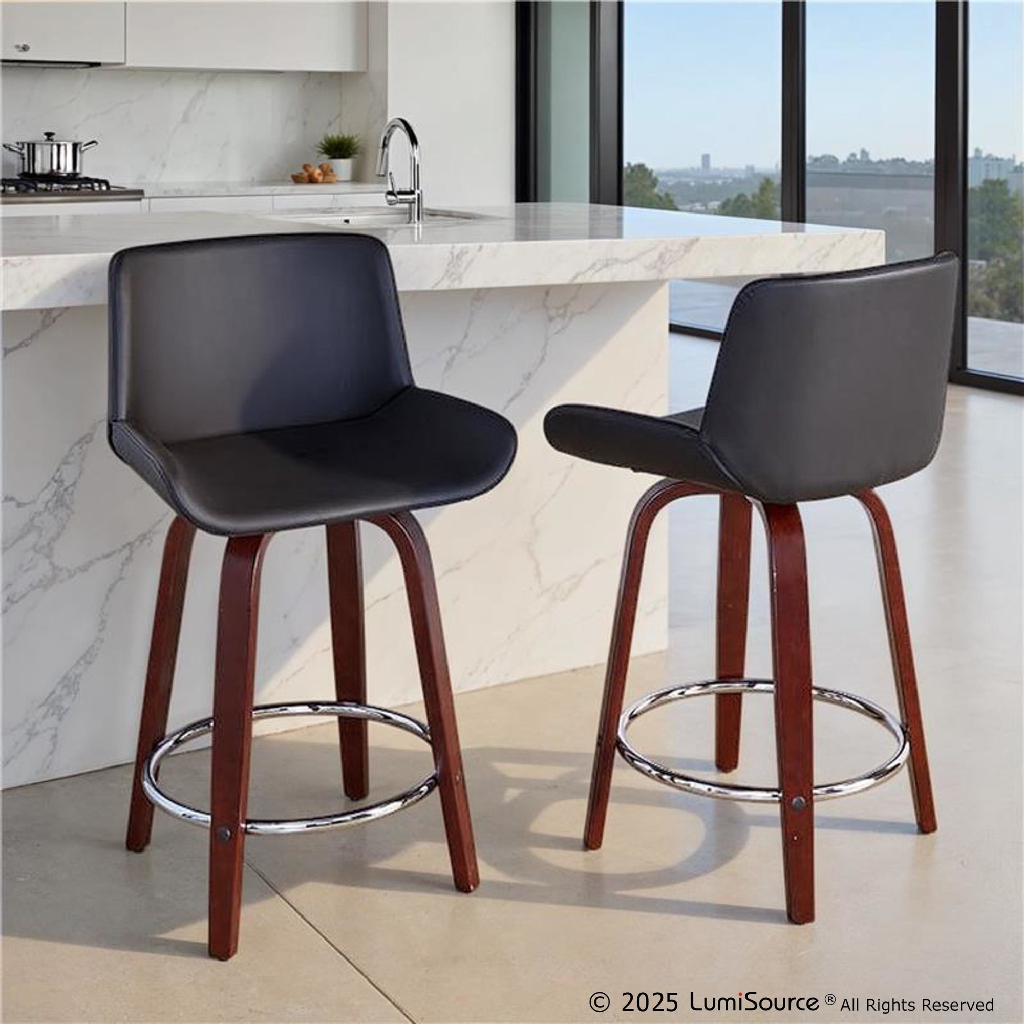Elevate your space with the sleek Santi Upholstered Fixed-Height Counter Stool by LumiSource. Featuring elegant bent wood legs and a plush faux leather seat, this stool offers modern sophistication with its minimalist armless design. The gently curved back and contoured seat edges provide both style and comfort, making it a perfect addition to your kitchen island or home bar. Available in various upholstery colors and finishes, choose the one that suits your space best!