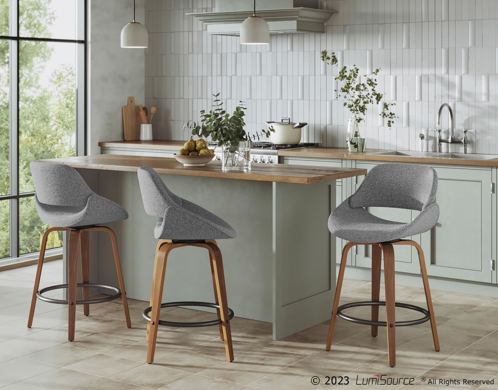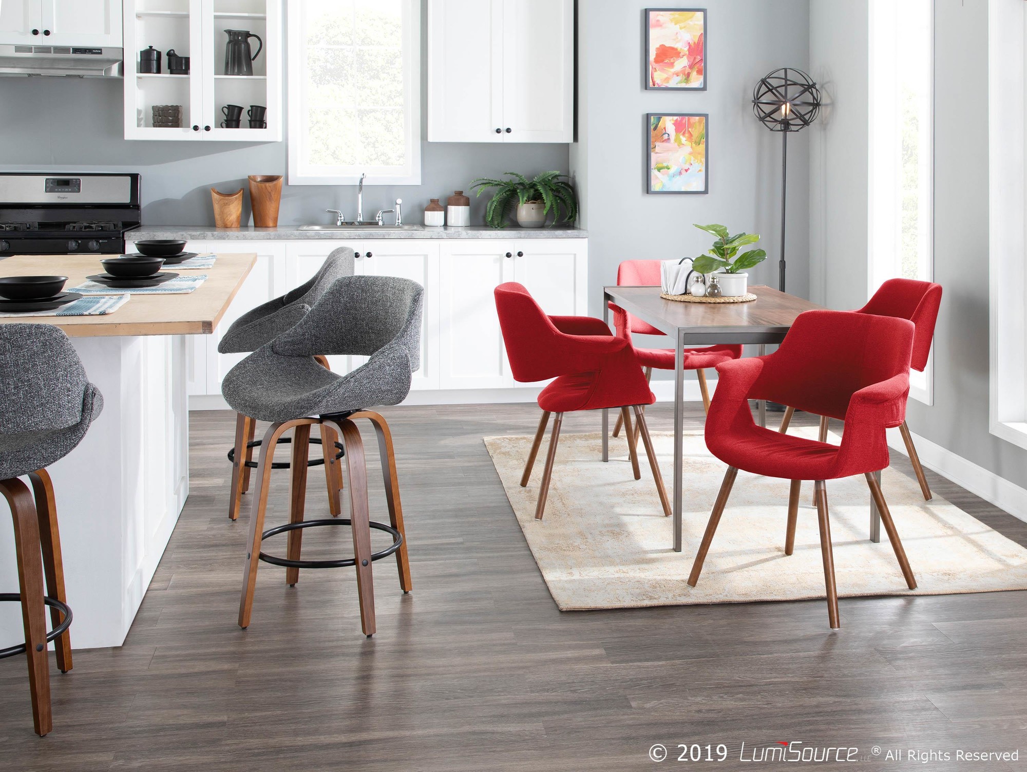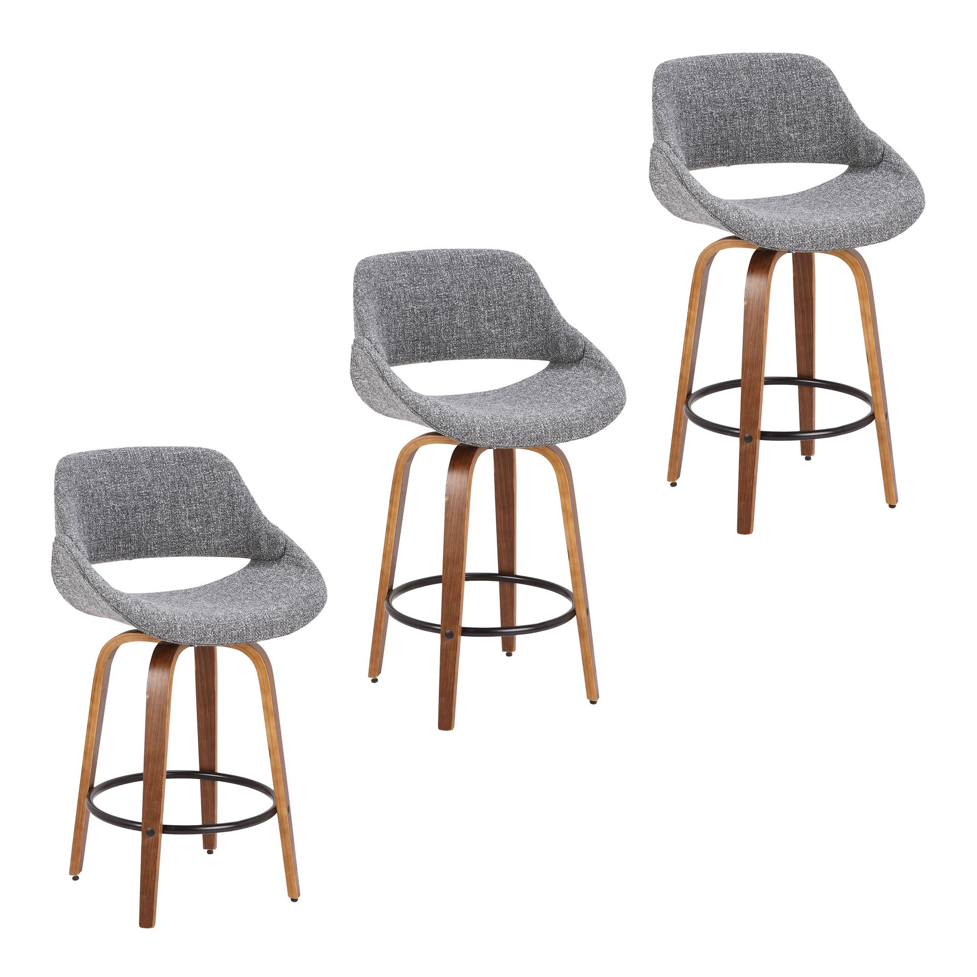 The wide and welcoming seat of the LumiSource Fabrico Counter Stool beckons one to sit and relax. A curved back and contoured upholstered seat is accented by flared walnut wood swivel legs that add to the stylish yet comfortable design. Available in a variety of upholstery colors, choose the one that suits your space best.