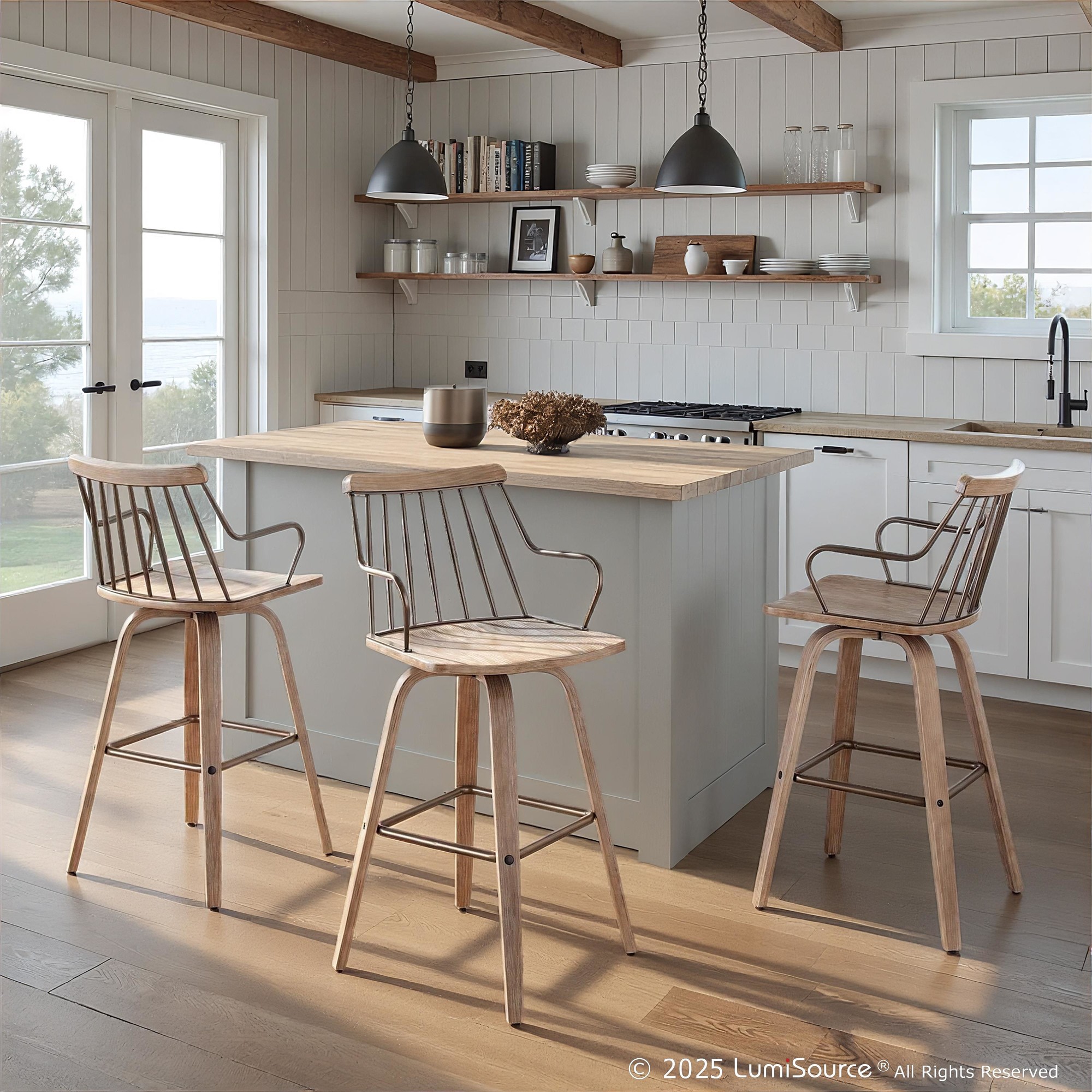 Perfect for your farmhouse inspired space, the Preston Counter Stool features stylish white washed wood, a metal spindle backrest, and a swivel seat. Ultra versatile, the Preston is great for use in any kitchen, bar, or break room.