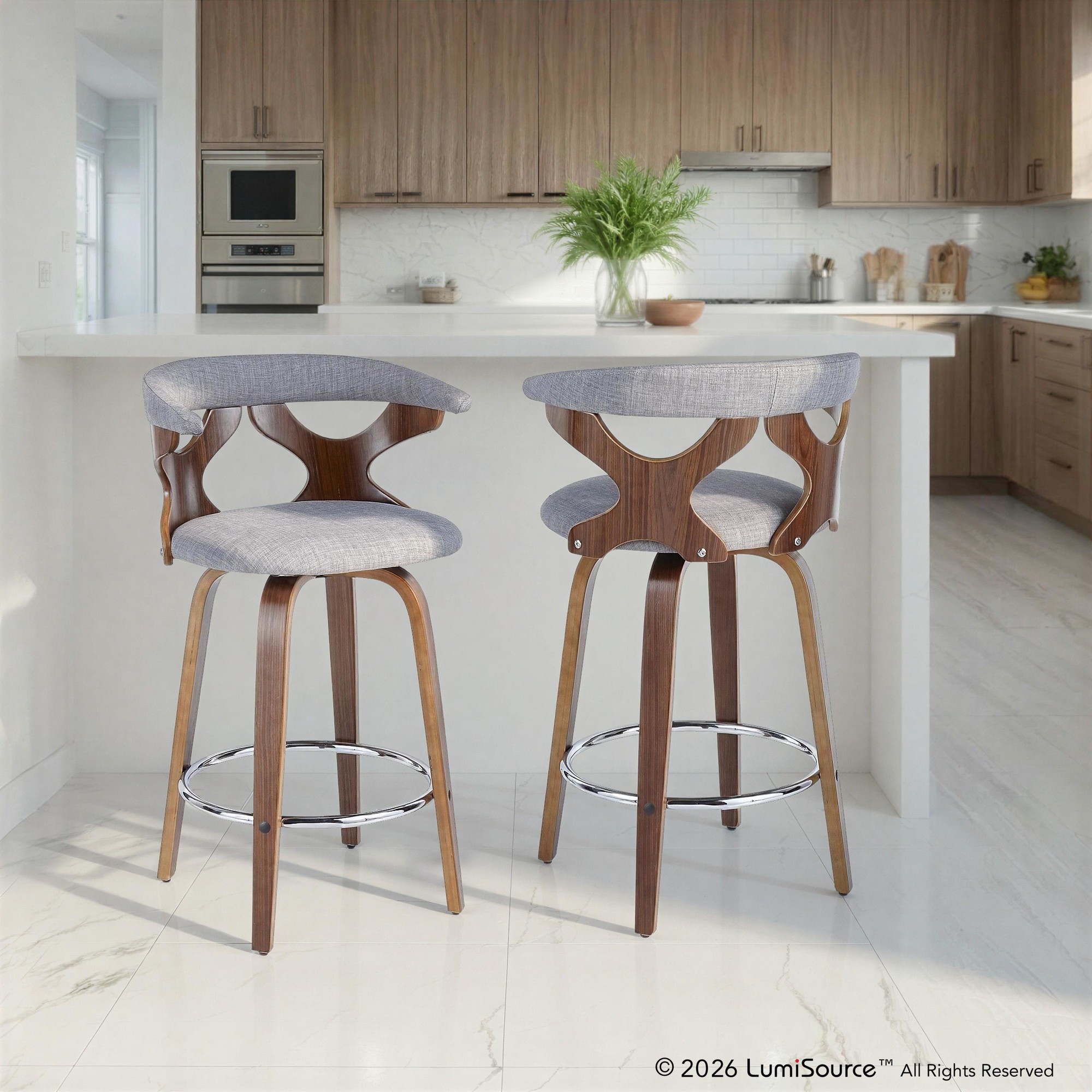 The unique cut-out design that forms the back of the Gardenia Counter Stool by LumiSource adds considerable visual interest to this exciting option for counter height seating. The rounded back adds comfort while the woven fabric upholstery lends a dressed-up air. The Gardenia comes in various finishes, so choose the one that fits you best!